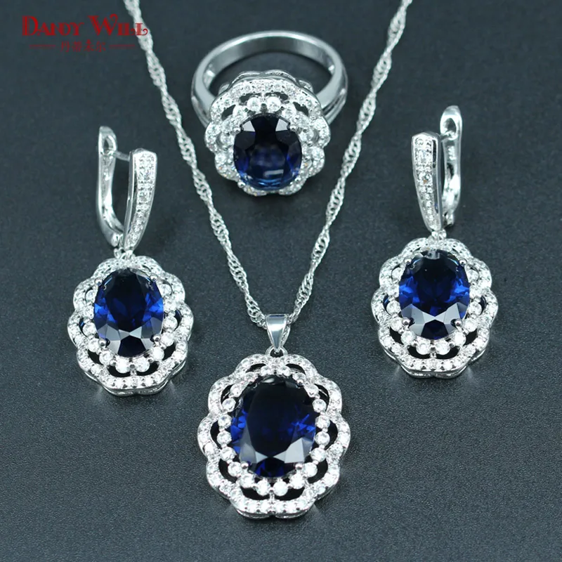 DANDY WILL Blue Crystal White 925 Silver Stamp Jewelry Sets For Women Silver Color Necklace/Earring